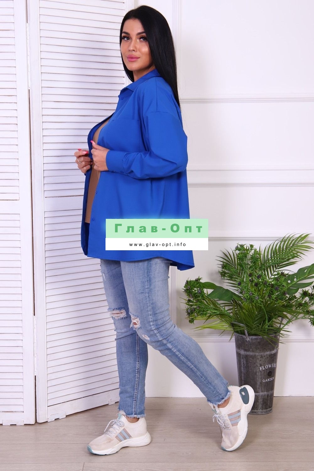 Туника рубашечного кроя, оверсайз, с длинным рукавом. Фигурный низ, застегивается на пуговицы, два нагрудных кармана.
