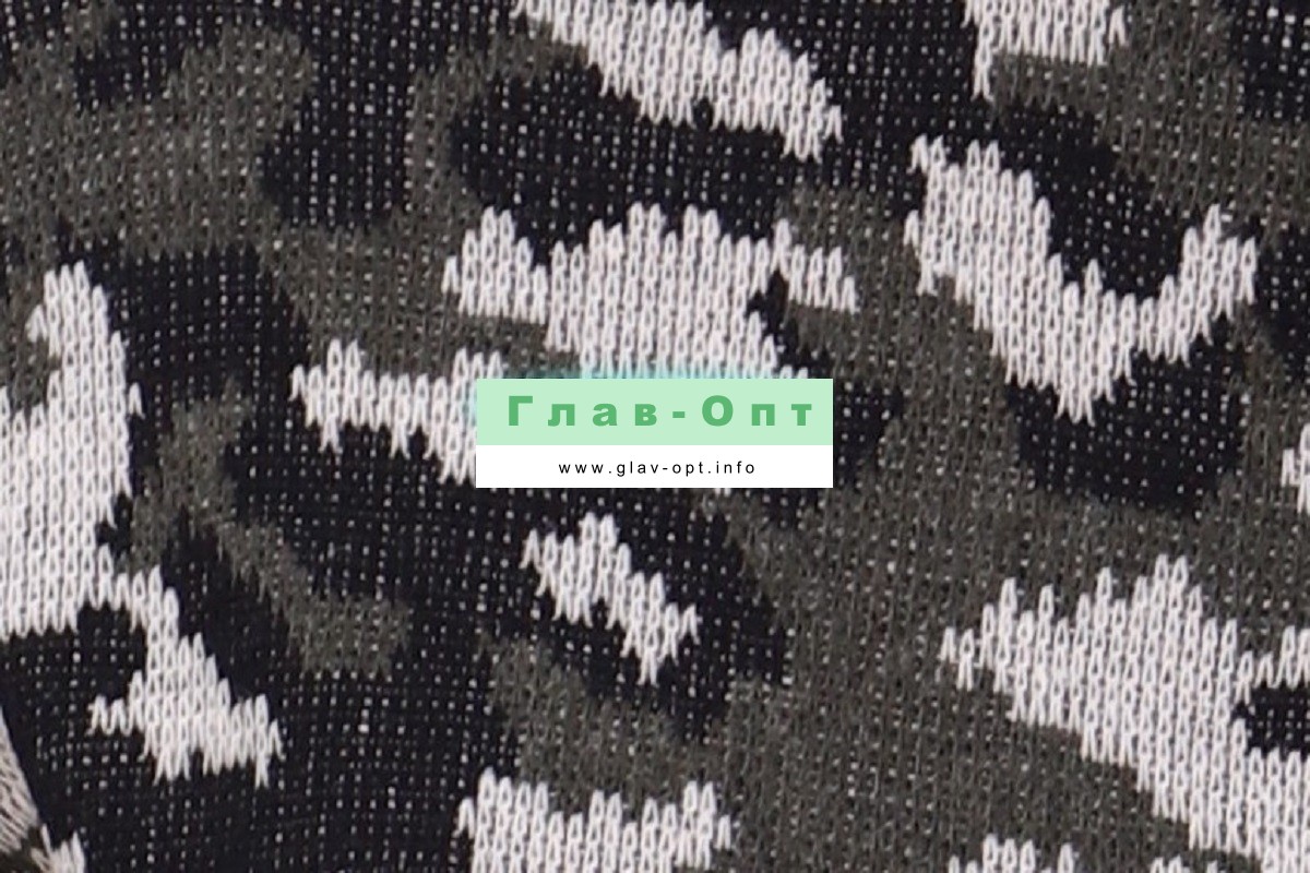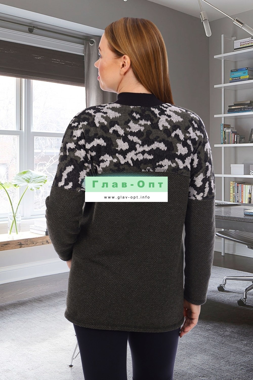Туника женская прямого силуэта. Рукав цельнокроенный со швом. Полочка короче спинки. Воротник-стойка из кашкорсе. На полочке два нагрудных накладных кармана, по боковому шву разрезы, слегка перенесенные в сторону полочки. Туника из однотонной ткани Пике , кокетки полочки и спинки, карманы из ткани Жакке с модным принтом камуфляж.