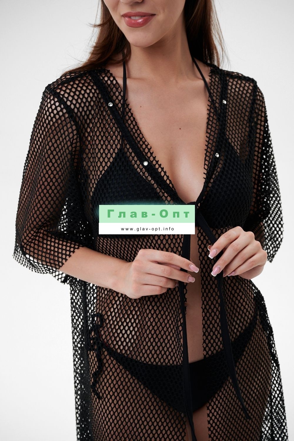 Туника пляжная, длинная, свободного силуэта, на груди завязывается, горловина оформлена декоративными стразами.