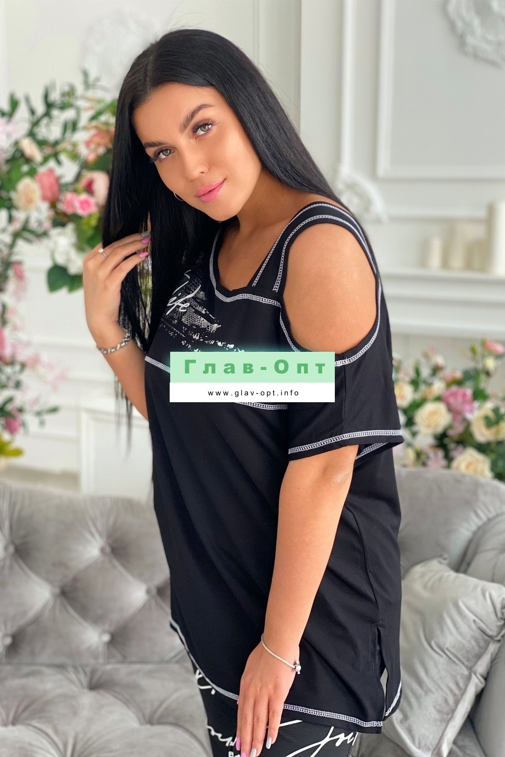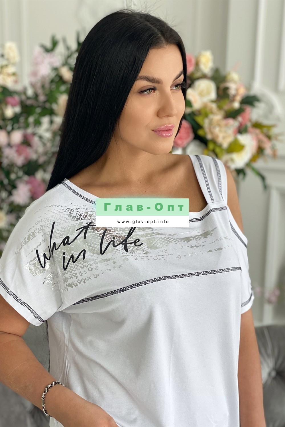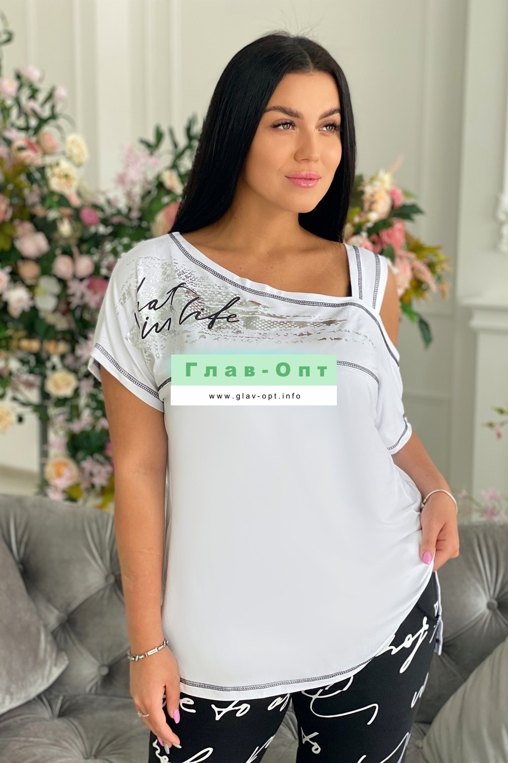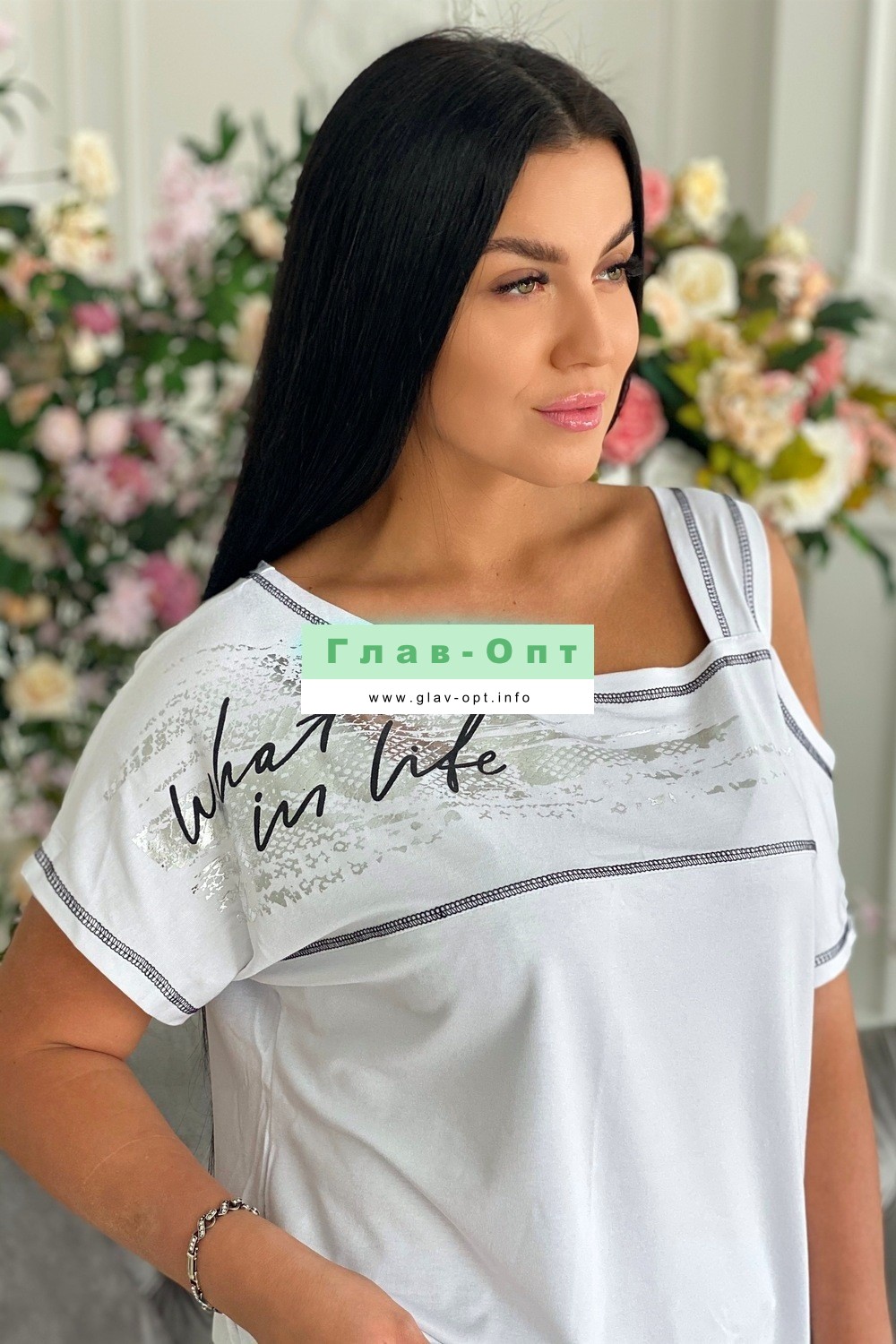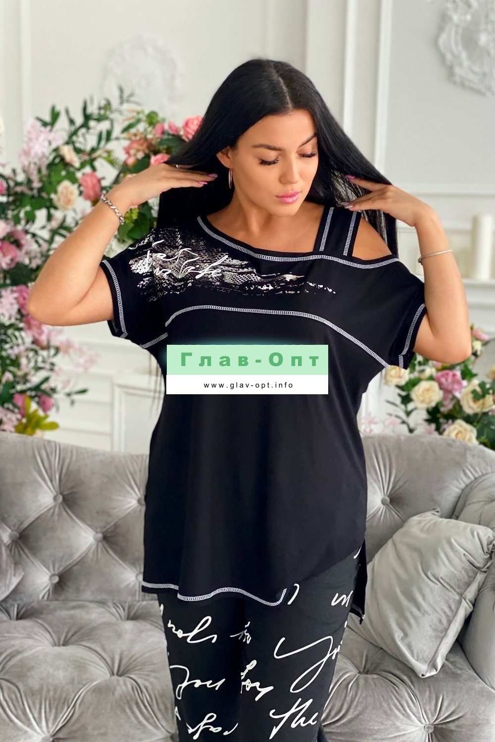 Туника женская полуприлегающего силуэта. Рукав цельнокроенный короткий, с одной стороны бретель на плече, в боковых швах разрезы. В верхней части полочки модный принт.