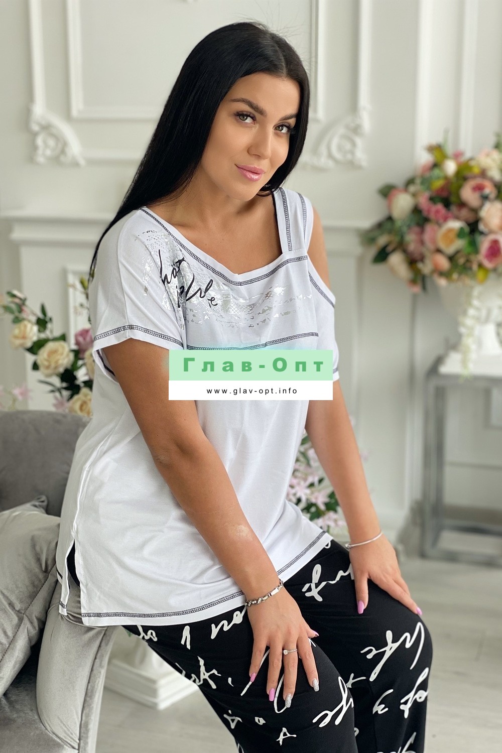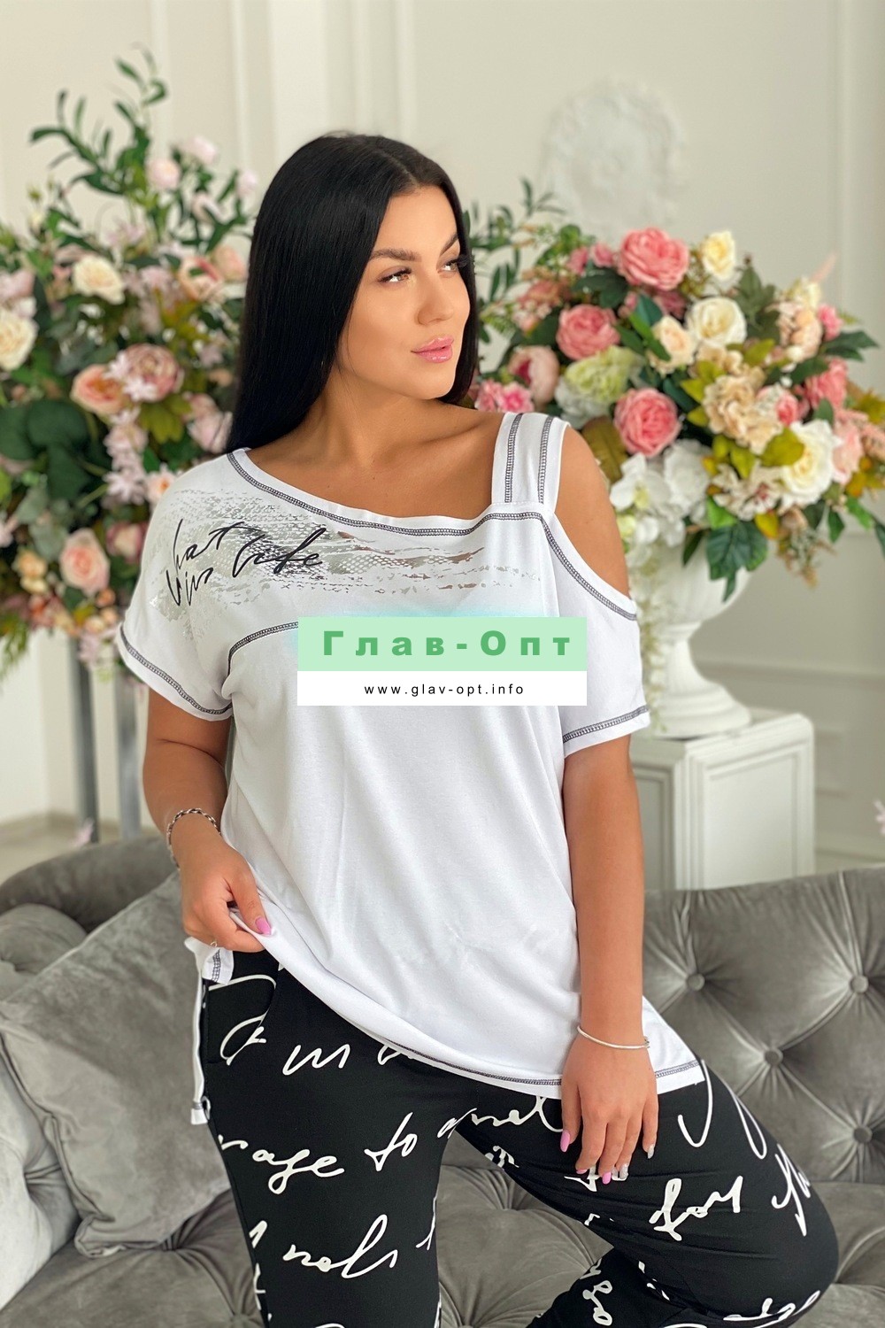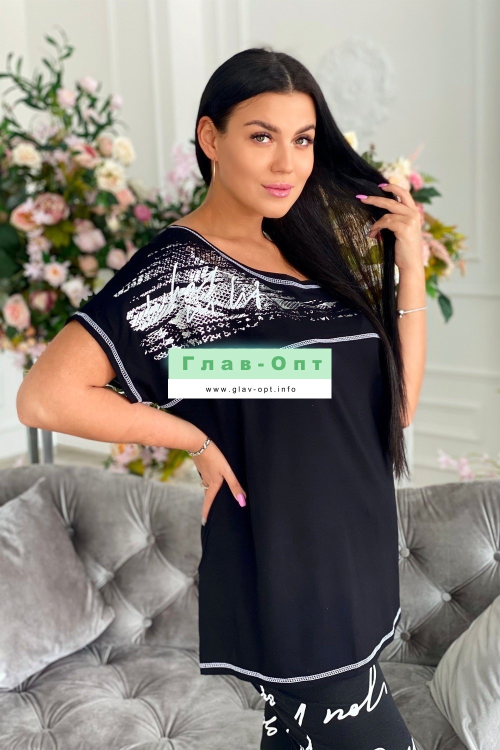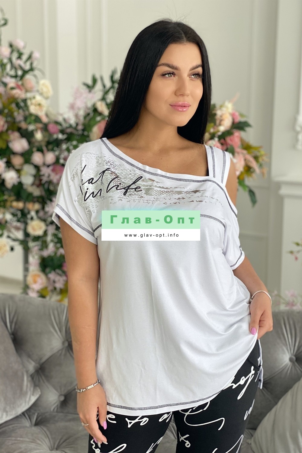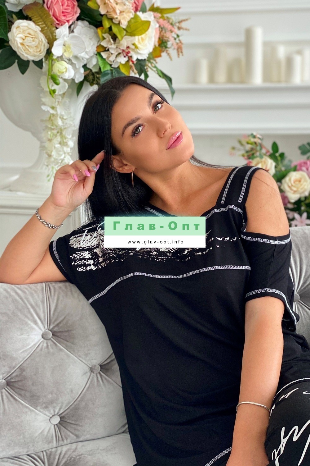 Туника женская полуприлегающего силуэта. Рукав цельнокроенный короткий, с одной стороны бретель на плече, в боковых швах разрезы. В верхней части полочки модный принт.
