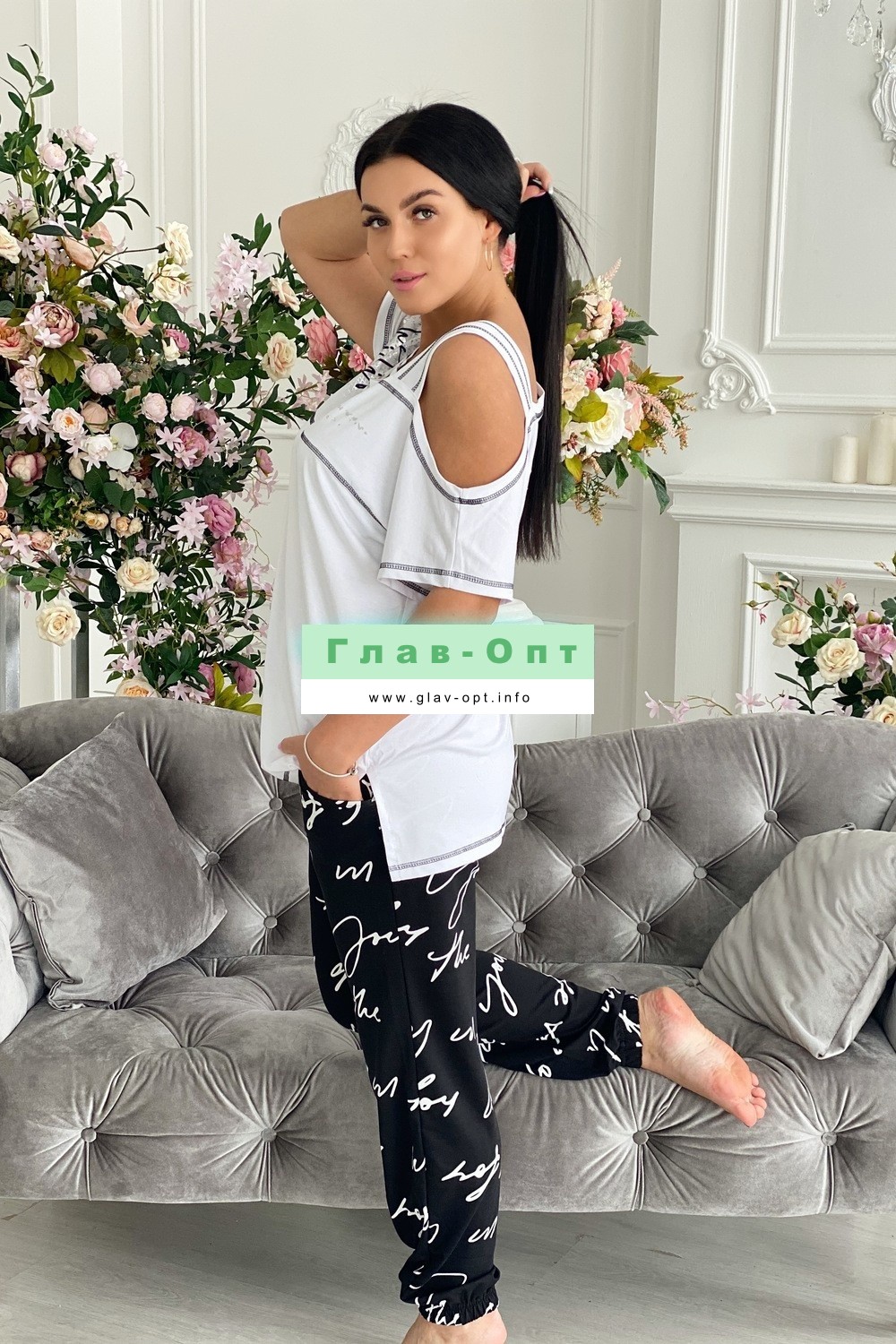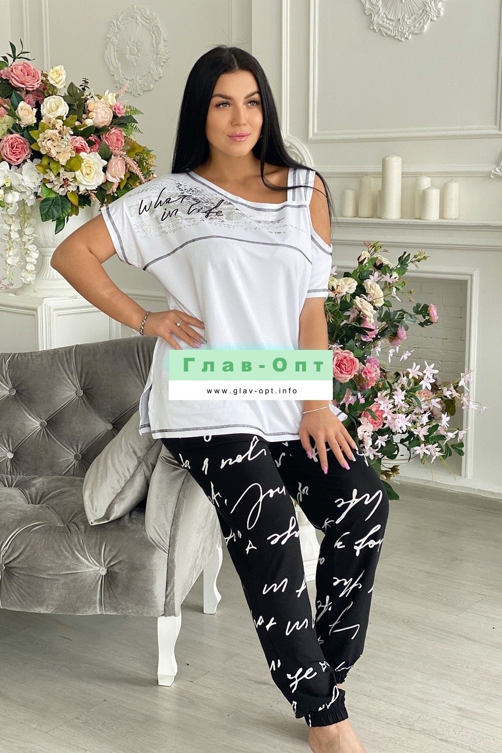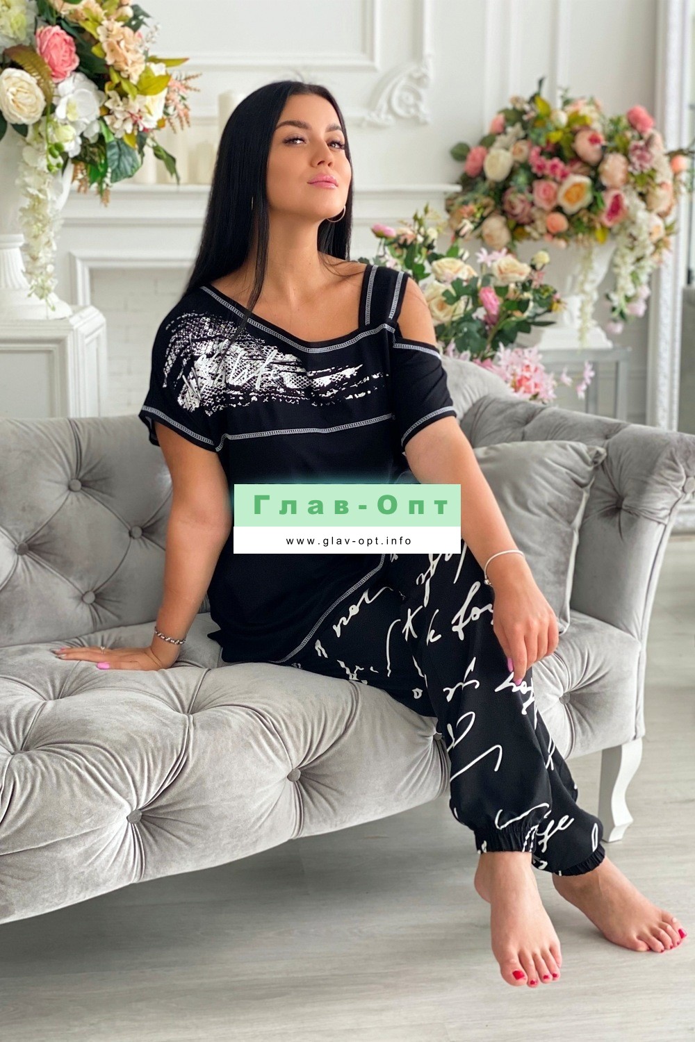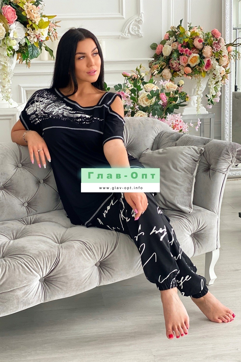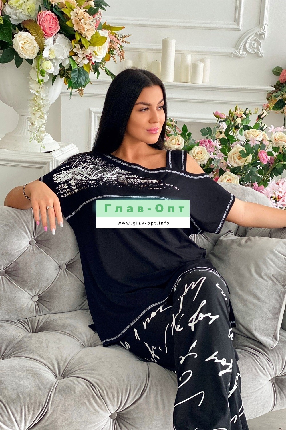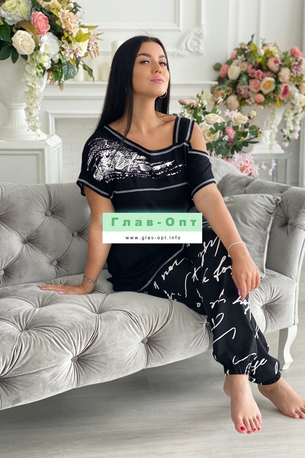 Туника женская полуприлегающего силуэта. Рукав цельнокроенный короткий, с одной стороны бретель на плече, в боковых швах разрезы. В верхней части полочки модный принт.