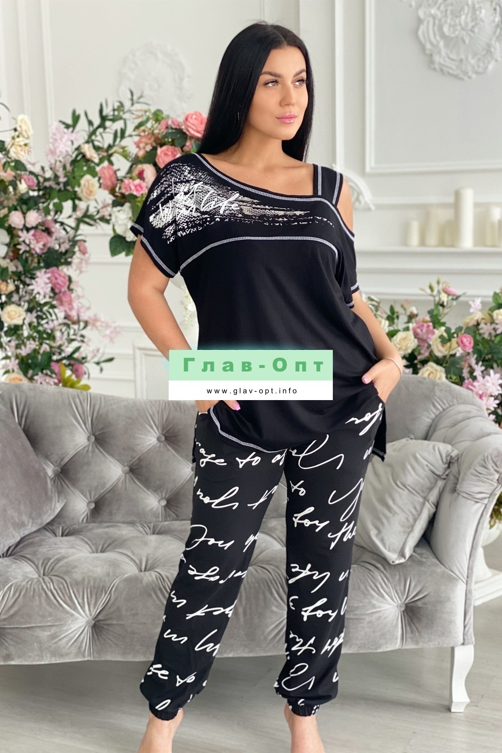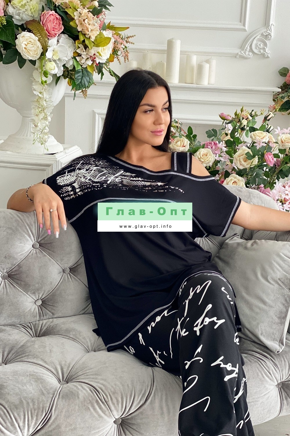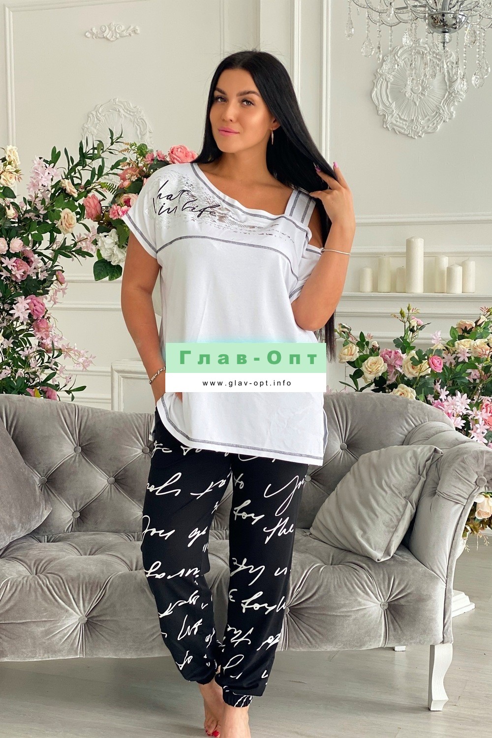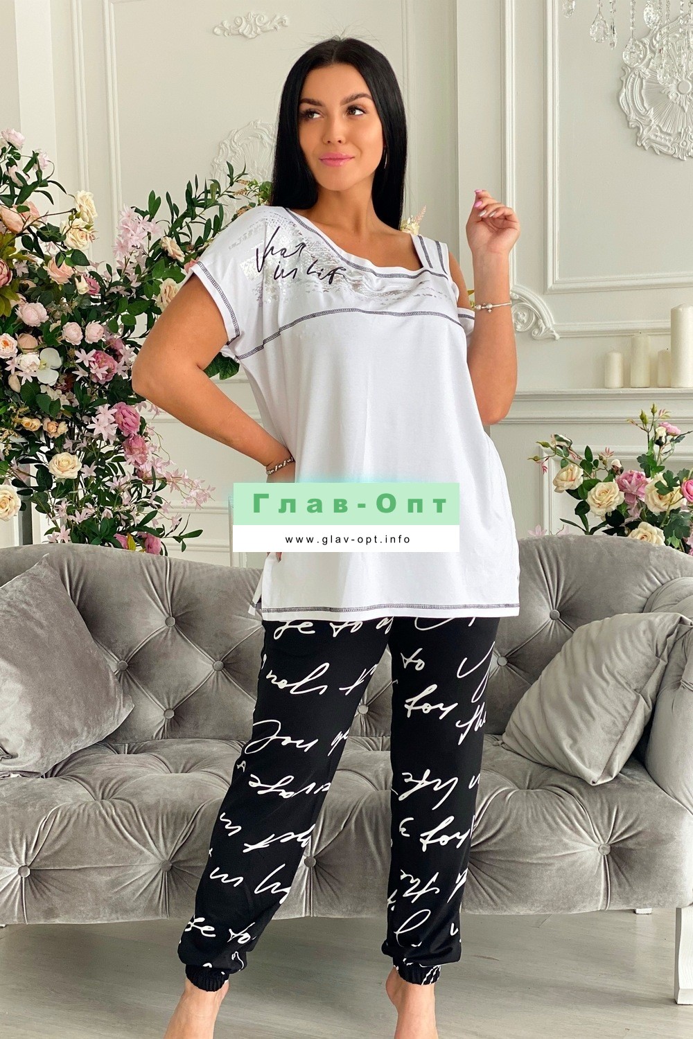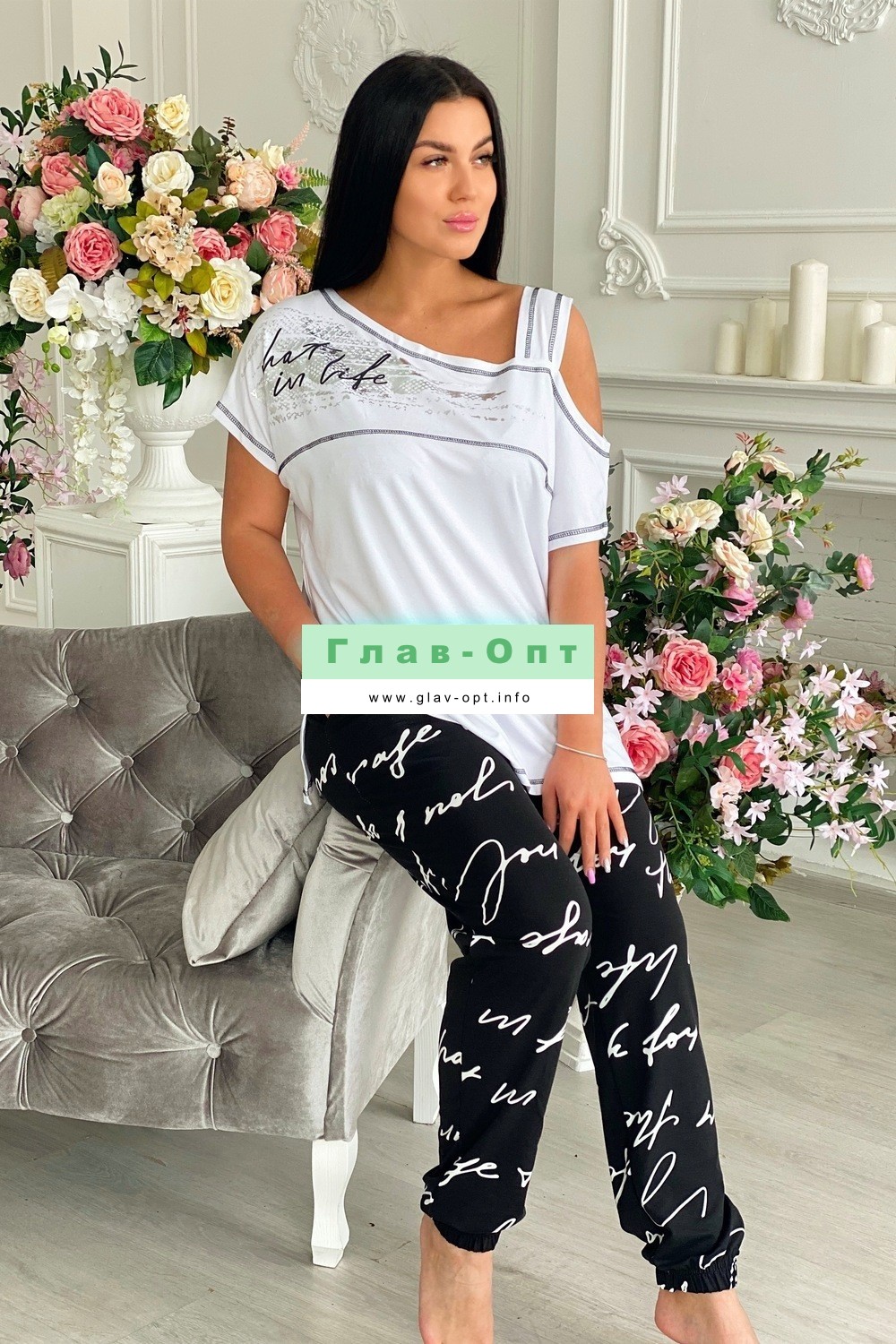 Туника женская полуприлегающего силуэта. Рукав цельнокроенный короткий, с одной стороны бретель на плече, в боковых швах разрезы. В верхней части полочки модный принт.