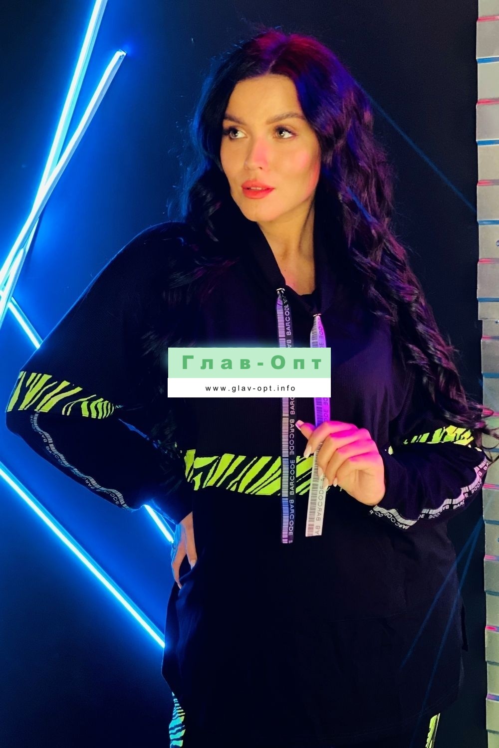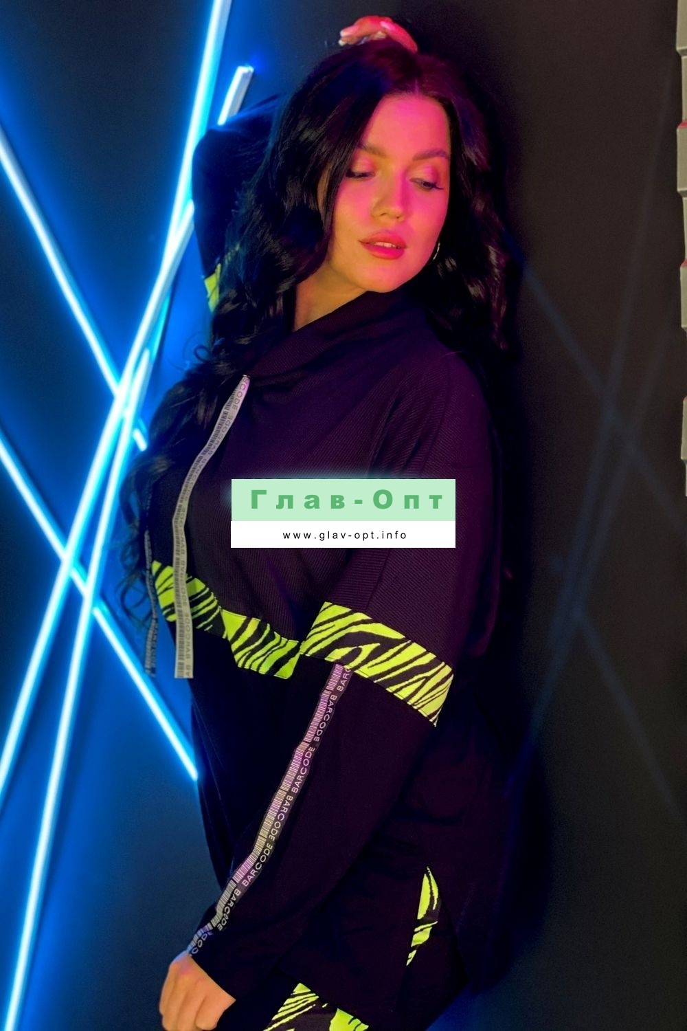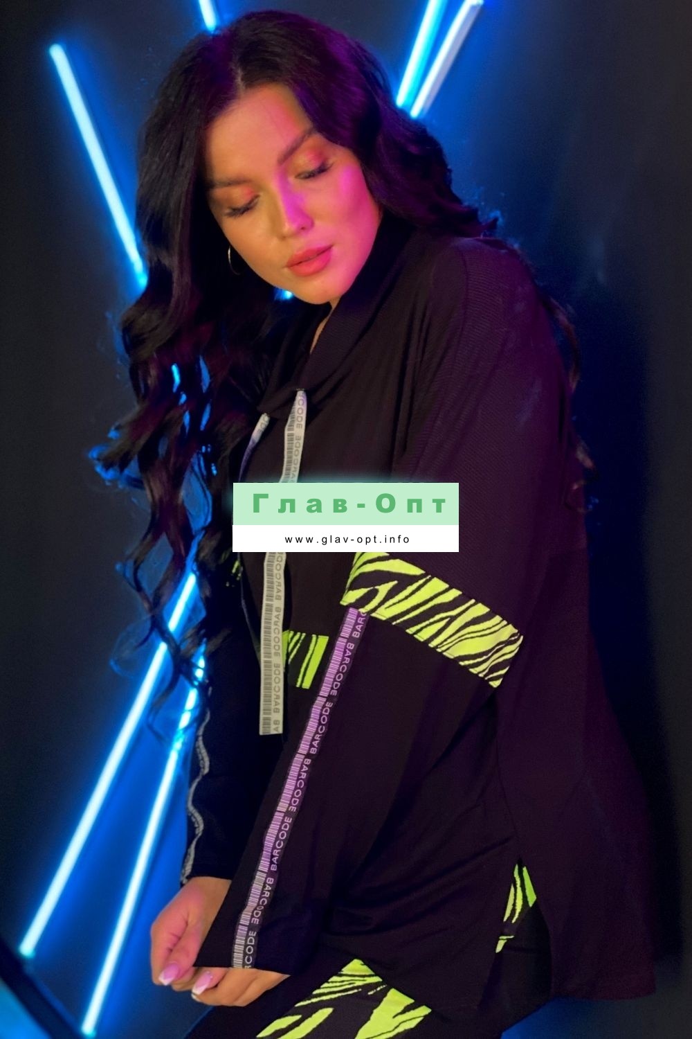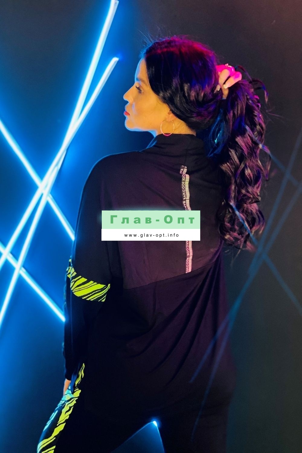 Туника женская прямого силуэта. Рукав цельнокроенный со швом. Воротник-стойка с люверсами и завязками. Верхняя часть полочки и спинки из кашкорсе. Нижняя часть туники из плотной вискозы. Вставки рукавов и полочки из яркой отделочной ткани. В нижней части полочки карман кенгуру .