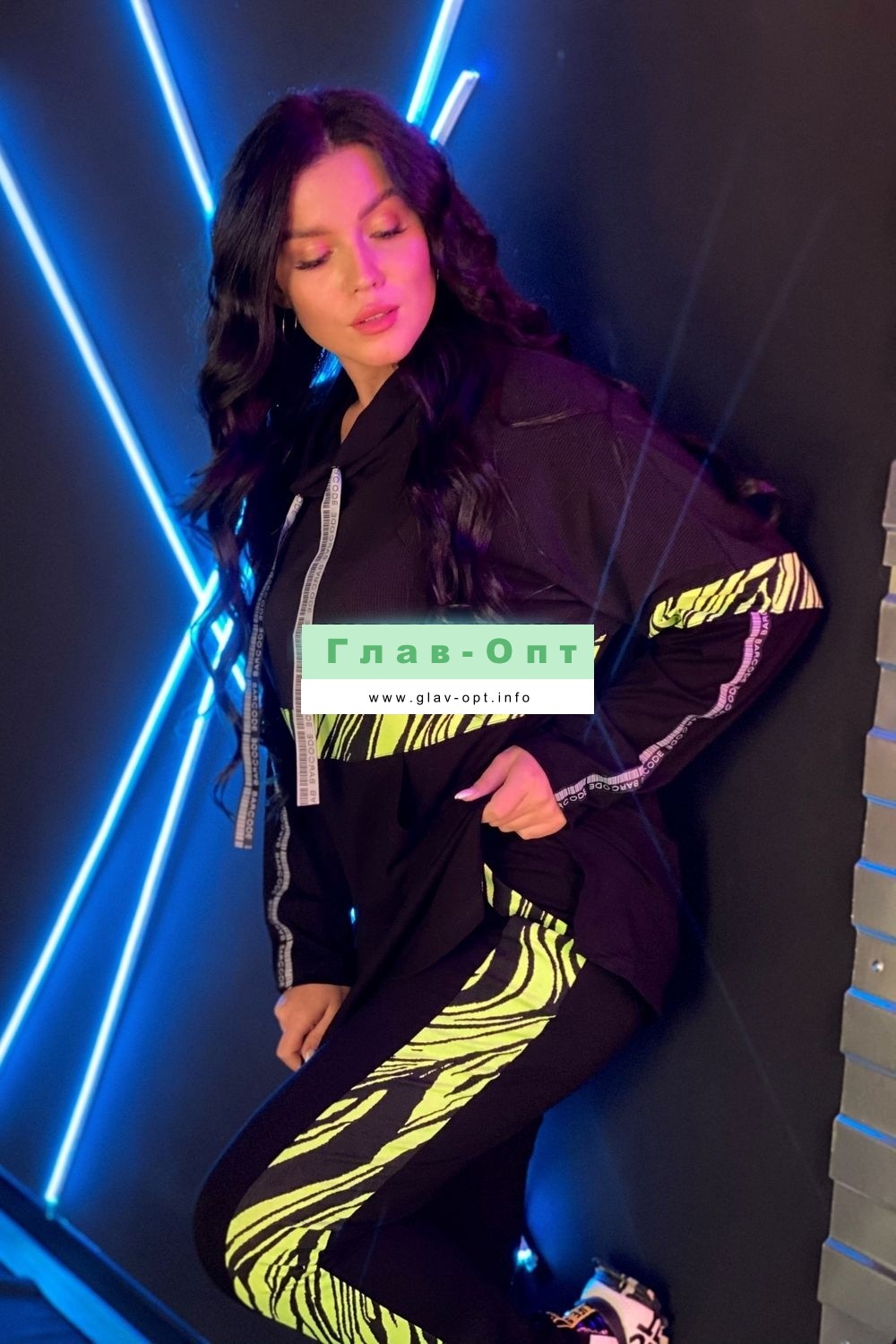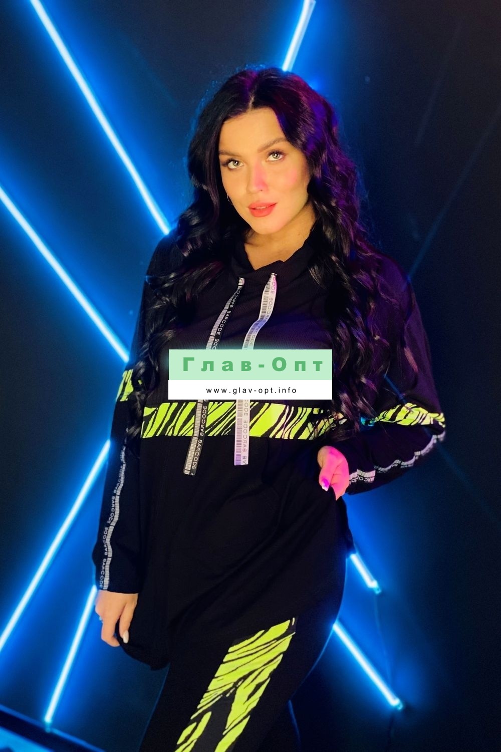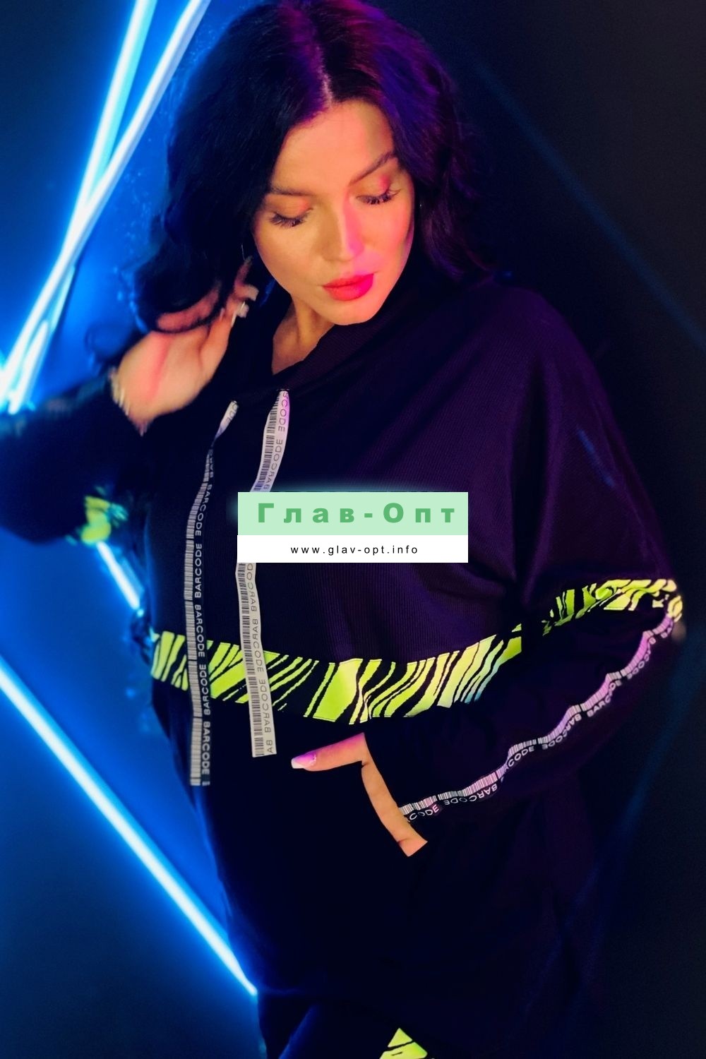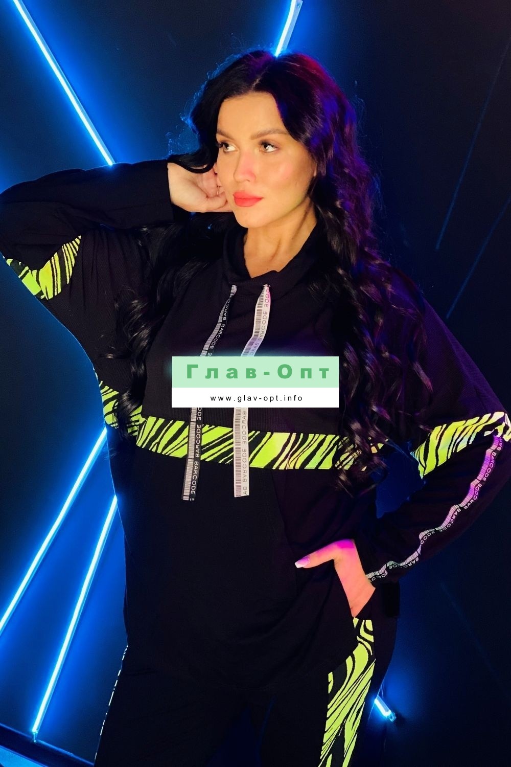 Туника женская прямого силуэта. Рукав цельнокроенный со швом. Воротник-стойка с люверсами и завязками. Верхняя часть полочки и спинки из кашкорсе. Нижняя часть туники из плотной вискозы. Вставки рукавов и полочки из яркой отделочной ткани. В нижней части полочки карман кенгуру .