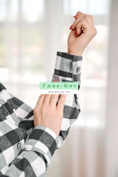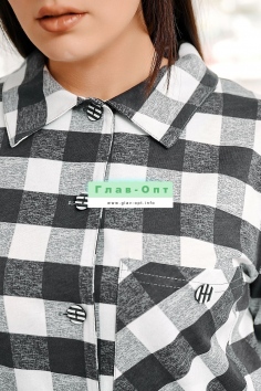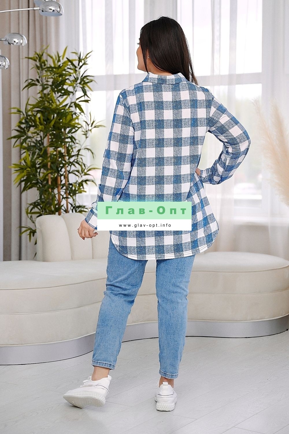 Туника женская прямого силуэта с отложным воротником. Застежка на петли - пуговицы. Рукав длинный, втачной с манжетой. Низ туники фигурный, спинка несколько длиннее полочки. На полочке нагрудный карман. На модели 52 размер