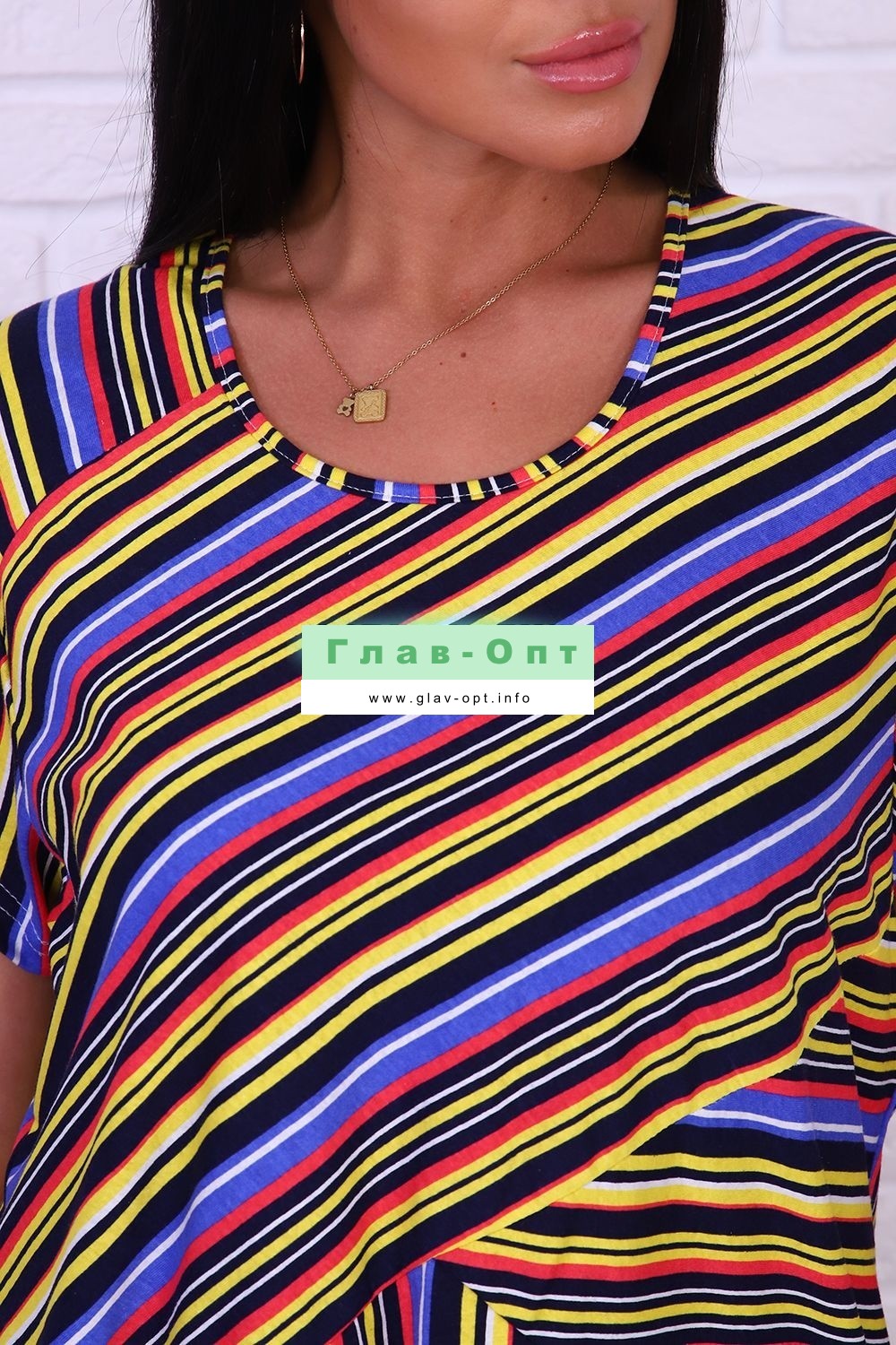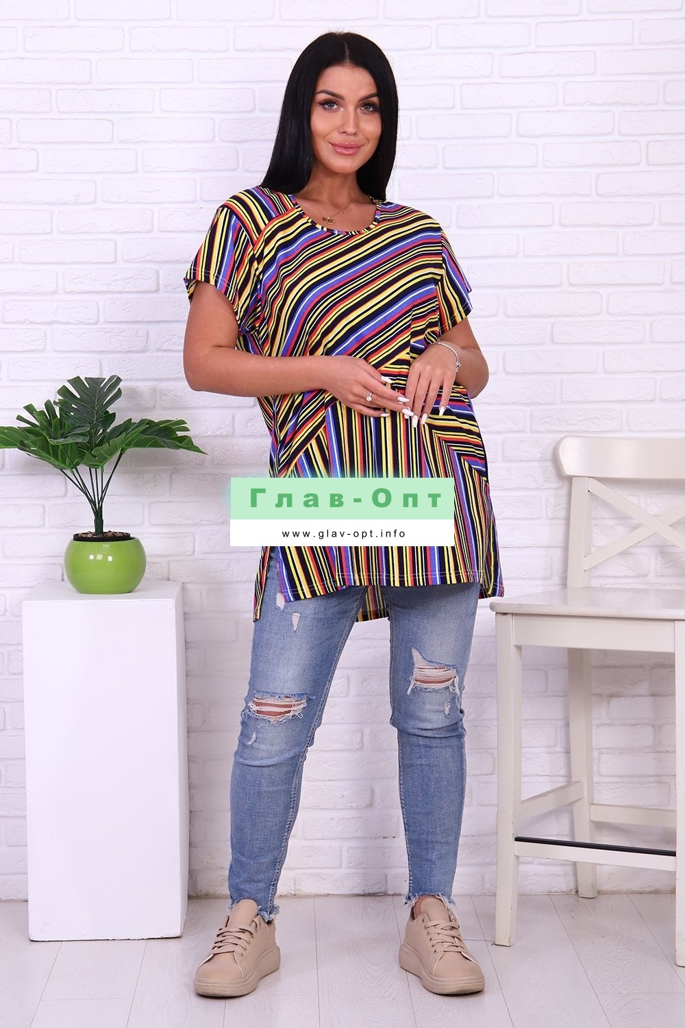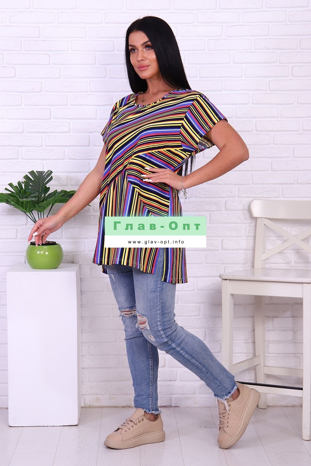 Туника женская приталенного силуэта с коротким рукавом, полочка оформлена асимметричными разрезными полосками, на спинке закладывается бантовая складка, в боковых швах имеются разрезы.