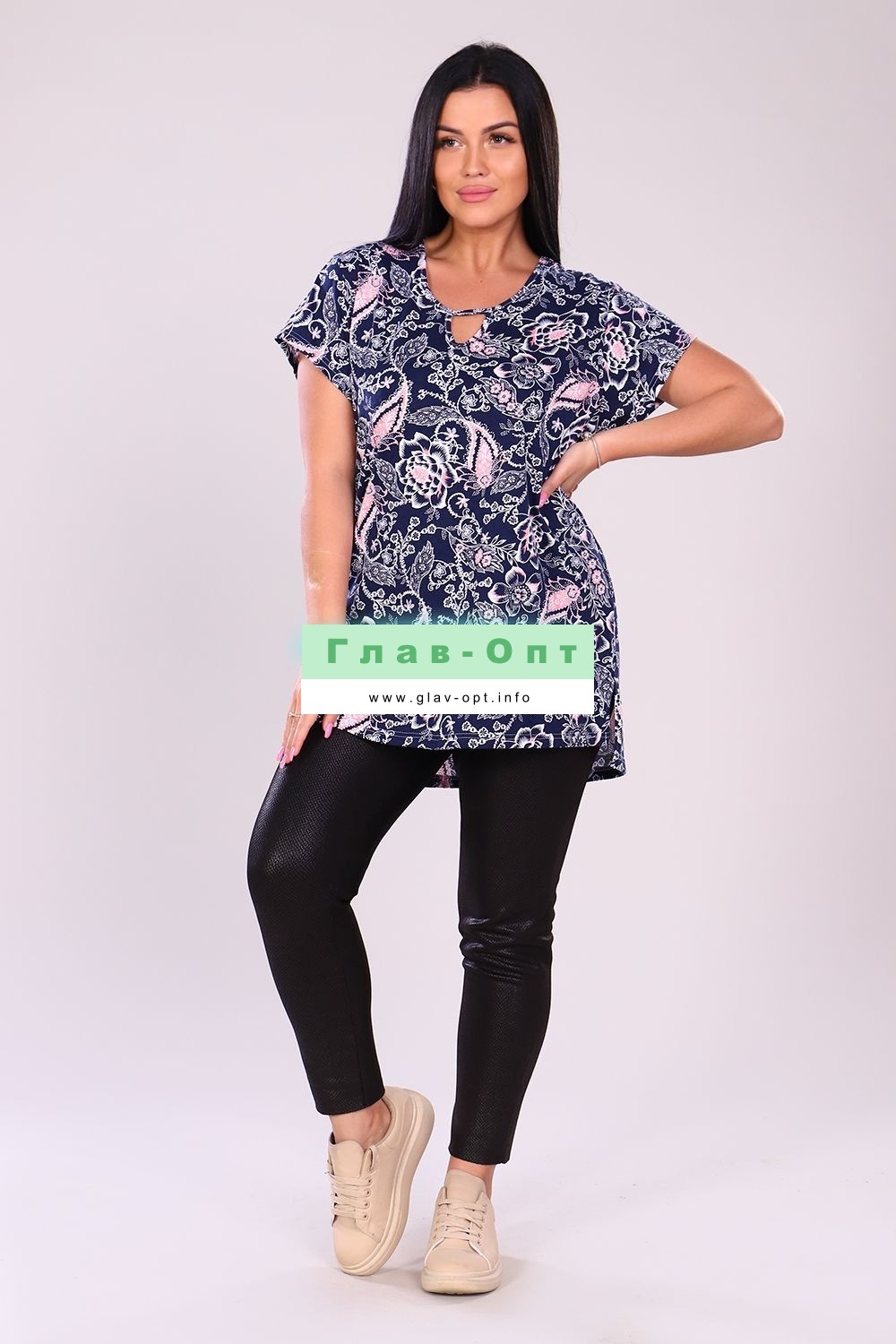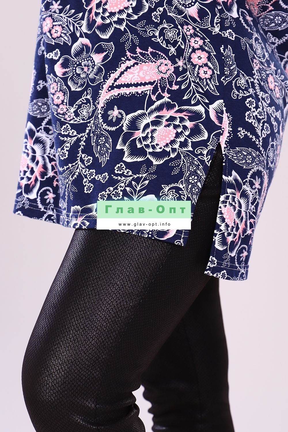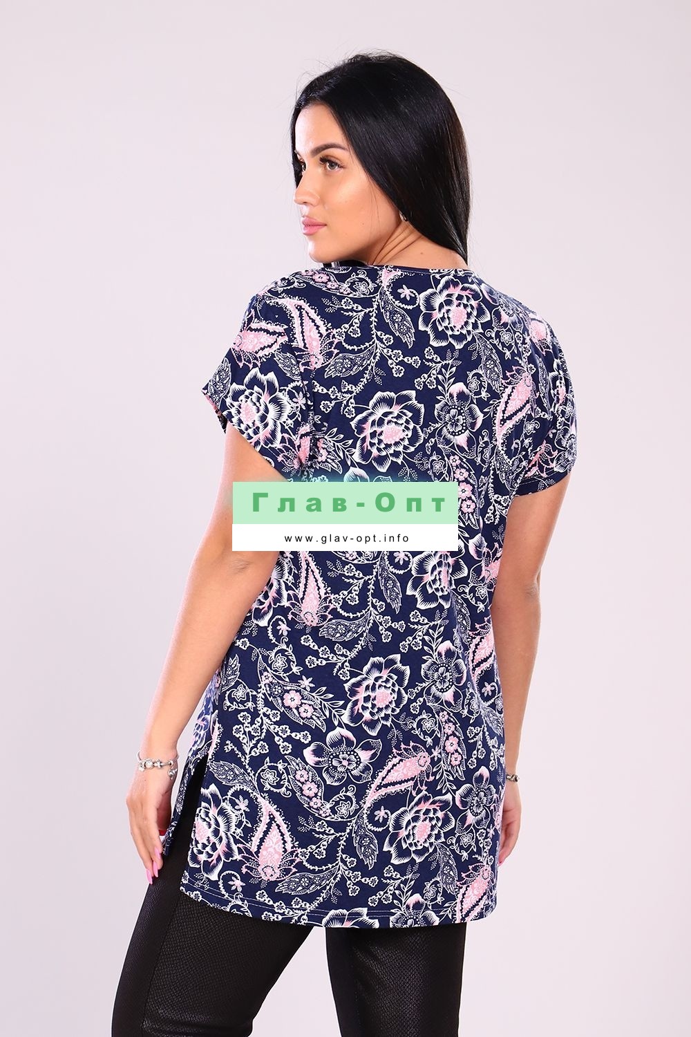 Туника женская прямого силуэта, короткий рукав. Горловина круглая, капелька на полочке отделаны бейкой. Туника удлиненная, по боковым швам разрезы. Туника с цветочным орнаментом подойдет к любому низу. Прекрасный вариант для повседневной носки.