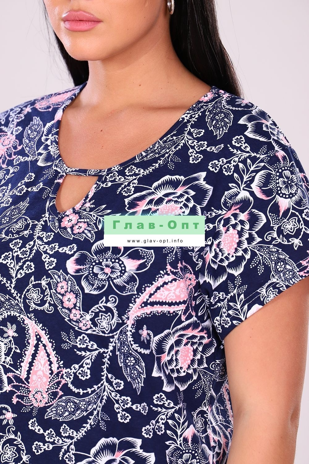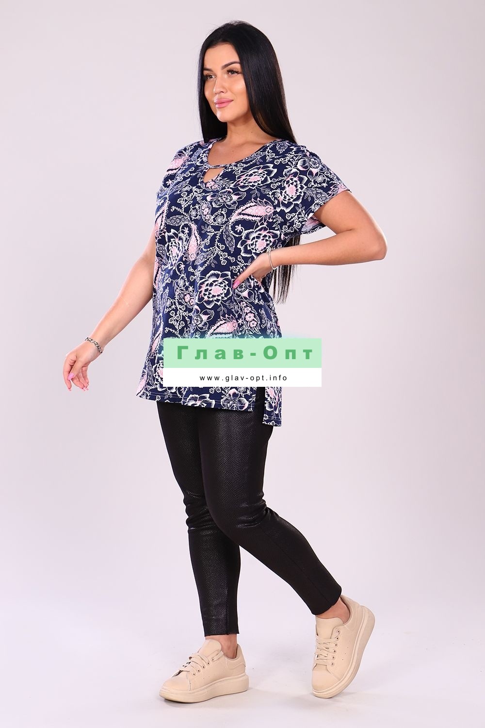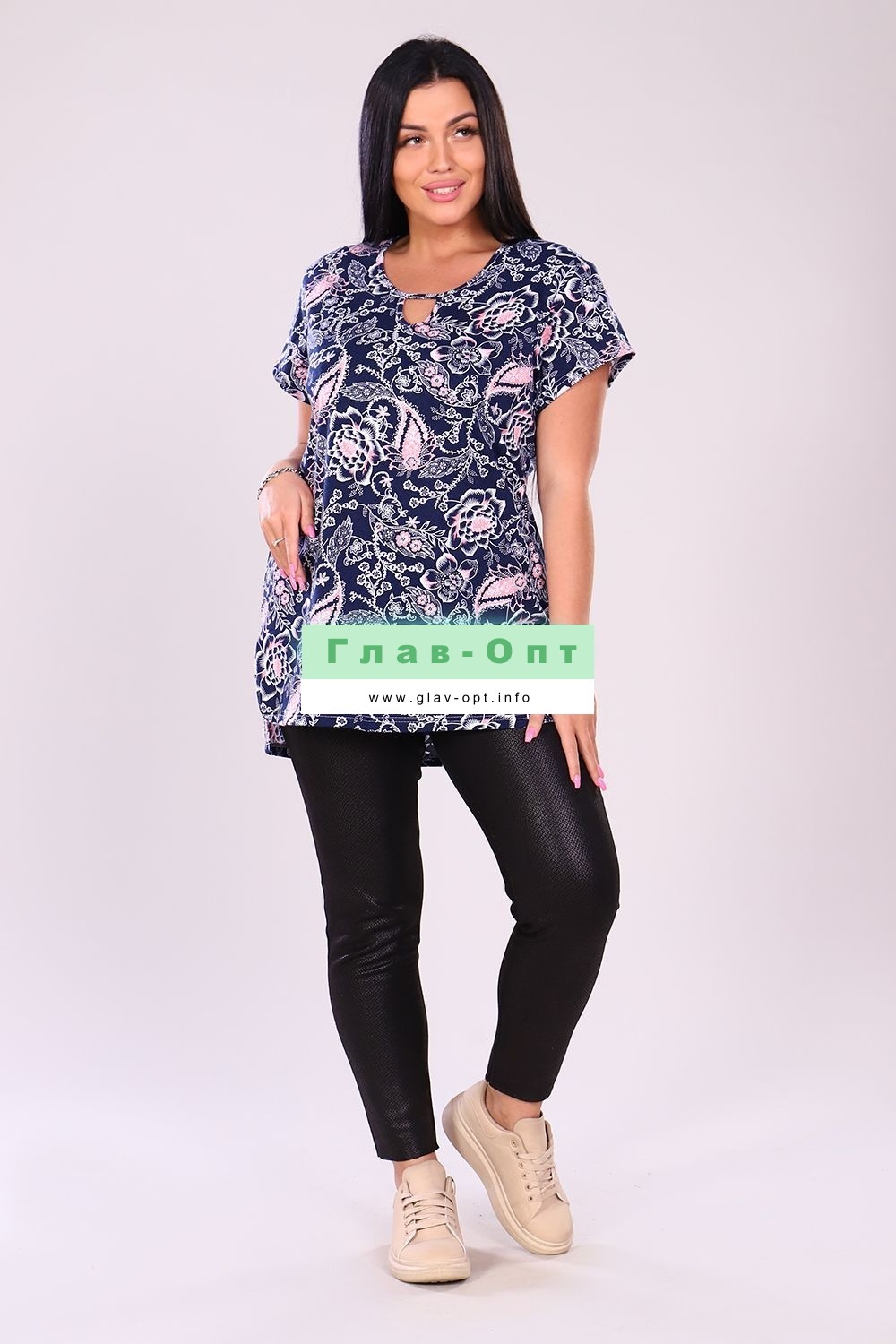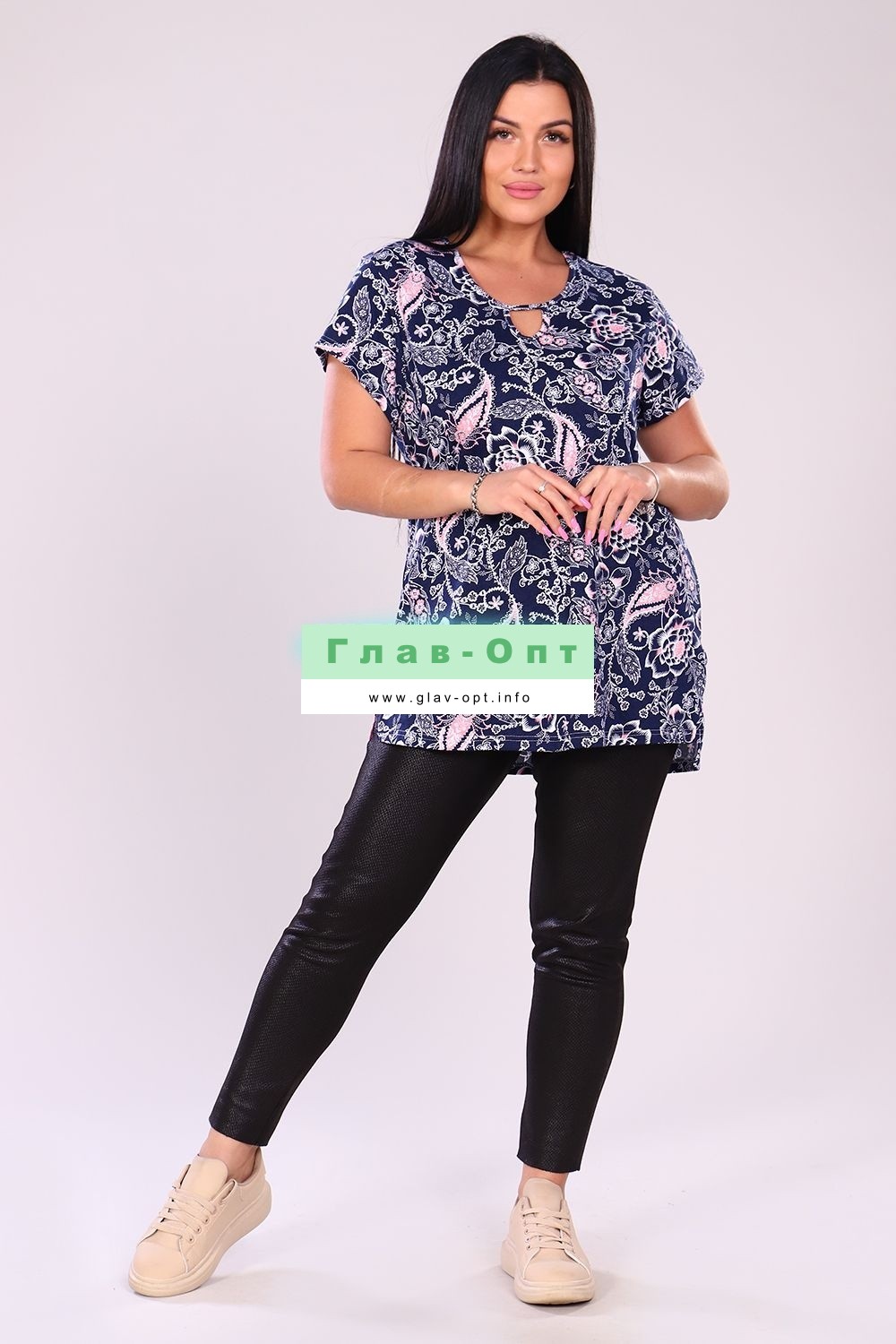 Туника женская прямого силуэта, короткий рукав. Горловина круглая, капелька на полочке отделаны бейкой. Туника удлиненная, по боковым швам разрезы. Туника с цветочным орнаментом подойдет к любому низу. Прекрасный вариант для повседневной носки.